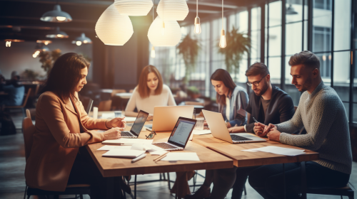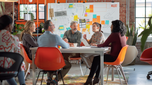 imagine prompt: A diverse team brainstorming around a modern conference table, whiteboards filled with ideas in the background. The team is engaged, exchanging thoughts, vibrant expressions. Bright, natural lighting, industrial office design. Created using: teamwork, collaboration, modern office, energetic atmosphere, vivid colors, hd quality, natural look --ar 16:9 --v 6.0