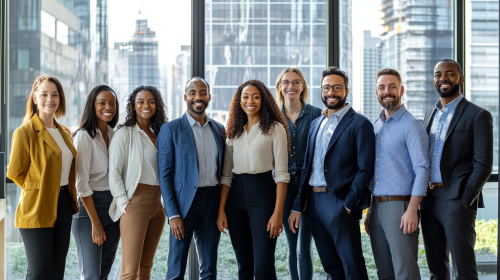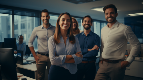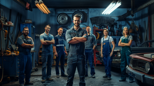 a group photo portrait team of happy, upscale auto repair professionals, with perfect smiles, working in a beautiful current day car repair garage, deep details, wide screen, photo hyper realistic, best quality, 4K --ar 16:9 --v 6.0