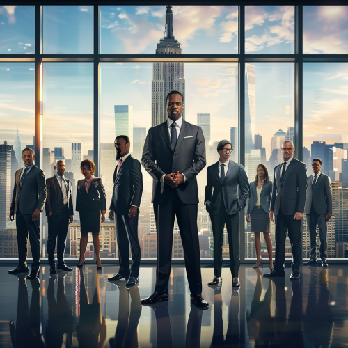 Generate a digital art for A digital art scene depicting a confident leader addressing a team in a modern office setting. The leader is speaking with assurance, while team members listen attentively, illustrating a moment of overcoming a challenging situation. The background should be in shades of light gray. --ar 12:5 --quality .5