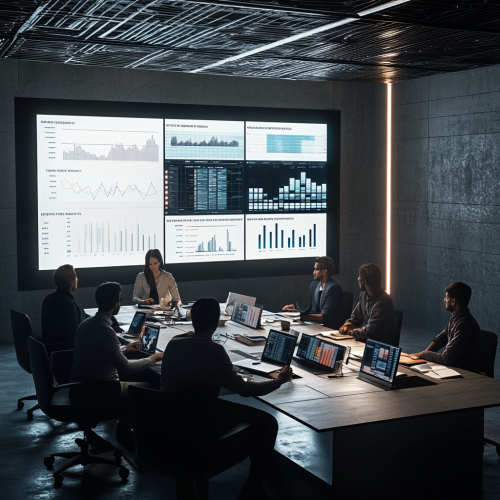 AI-powered analytics in business setting, team of professionals analyzing financial data, advanced data visualizations, smart graphs and algorithms on large touchscreens, high-tech office