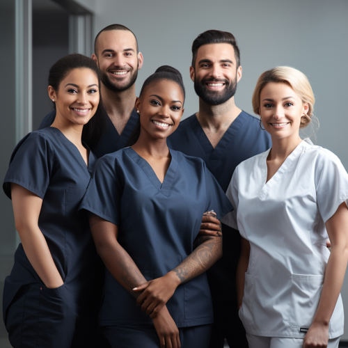 a team of dental professionals standing together as a team very confident and proud posing looking into the camera --v 5.2
