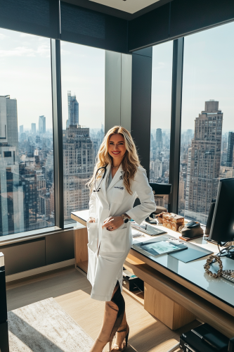 An American white female doctor in a doctor's uniform poses in her luxurious office with floor-to-ceiling windows overlooking the city. He is very rich: he has a notebook lying on his desk from the brand Louis Vuitton, a Louis Vuitton bag and Van Cleef bracelets and expensive rings on his hands and luxury brand items. photo taken on an iPhone 8, posted on Snapchat, the photo is a bit gloomy --style raw --s 50 --ar 2:3