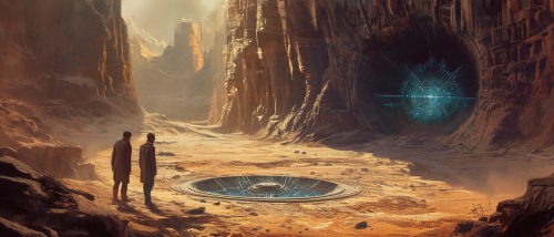 concept art style storyboard painting of two men discovering a large ancient ruin chamber, there is a massive circular hole in the ground, and floating up from the pit is a levitating small-sized wheel-shaped stone artifact with blue glowing runes, dramatic lighting, large environment semi-realistic oil painting, traditional art, wide angle, fantasy science fiction, Blackmagic Ursa Mini Pro 12K, --ar 21:9 --v 6.0