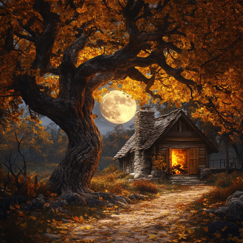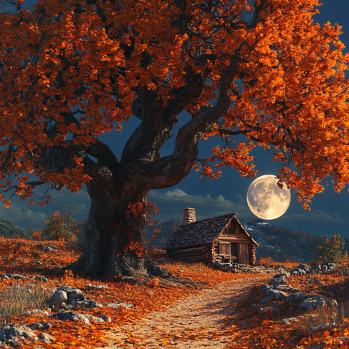 Hyper-Realistic, An oak tree, old and gnarly with fall leaves on a dirt path, perfectly round full moon peaking through the branches, small rustic cabin with a stone chimney is in the background, ultra HD, photo-realistic, vivid autumn