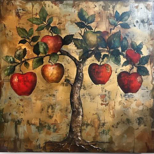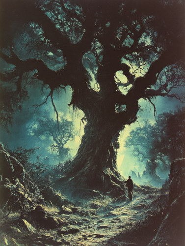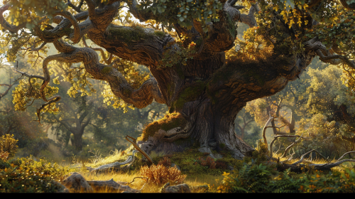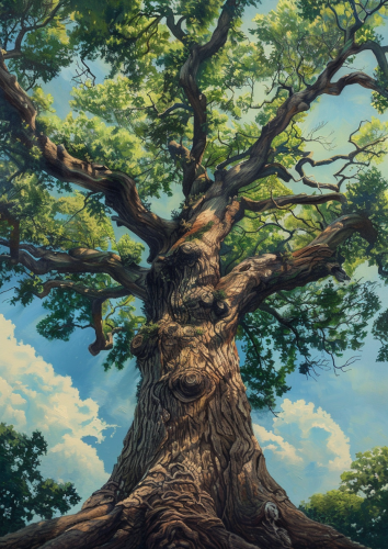 hyper detailed oil painting of a gigantic green oak tree, family tree --ar 500:707