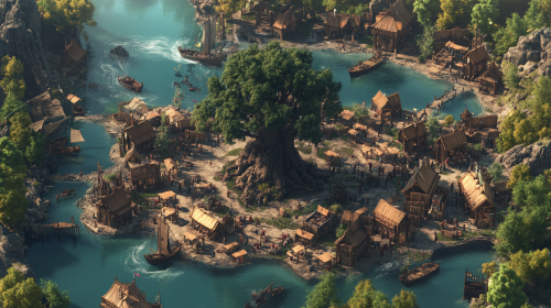 D&D 2D overhead battle map of an anglo saxon village on the bay of a large body of water, pacific northwest theme. Around thirty buildings. In the center of this village is a towering and ancient oak tree surrounded by a marketplace, used for rituals and festivals. --ar 16:9