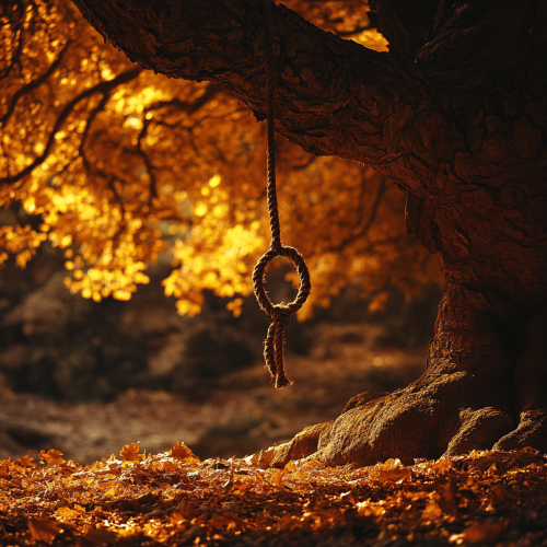 negative space, an old oak tree, close up empty noose hanging from a large branch, brown yellow leaves on the ground surreal --style raw --v 6.1 --s 250