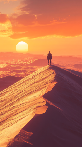 A stunning natural landscape featuring a vast desert with towering sand dunes, bathed in the warm glow of the setting sun. An adventurer stands atop a high dune, casting a long shadow on the golden sand. The sky is a gradient of orange and pink, with wisps of clouds adding texture. The overall atmosphere is serene and awe-inspiring, capturing the beauty and solitude of the desert. --ar 9:16