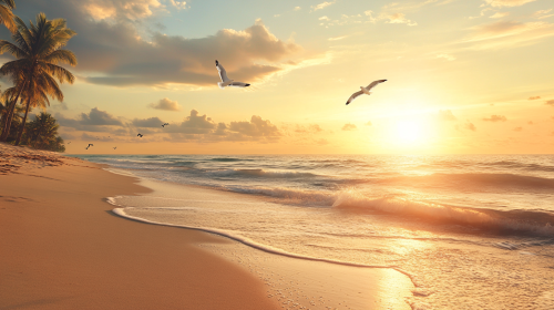 serene beach at sunset, golden sand stretching along the shore, gentle waves lapping at the coastline, seagulls soaring overhead, the sun painting the sky in hues of orange and pink, lush palm trees swaying in the breeze, composition focusing on the horizon where the sky meets the ocean, evoking a sense of peace and tranquility, in a style reminiscent of a classical Impressionist painting. --ar 16:9