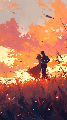 A picture using a watercolor style. Light color. A couple dancing slowly on a grassy field at sunset, barefoot, as the sky fades into warm oranges and pinks. They are lost in the moment, listening to their favorite song. --ar 9:16 --niji 6