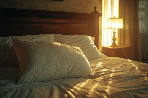 A cozy shot of a fluffy white pillow resting on a hotel bed, with a warm, diffused glow of golden-hour sunlight illuminating its surface. The scene captures the subtle textures of the pillowcase and linens, surrounded by a soft bokeh effect of a distant lamp on a nightstand. Moody atmosphere, hd quality, soft touch, natural light --ar 3:2 --v 6.0