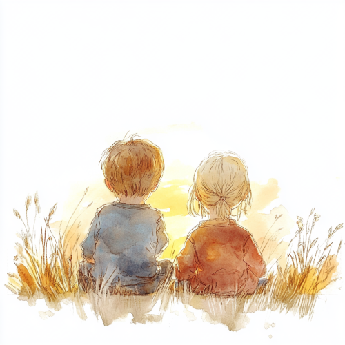 joyful little boy 2 years with brwon hair and blond girl with 4 years, seeing the sunset, in the style of minimalistic drawings, white background, ultrafine detail, creative commons attribution, mori kei, painted illustrations, serene faces, watercolor style