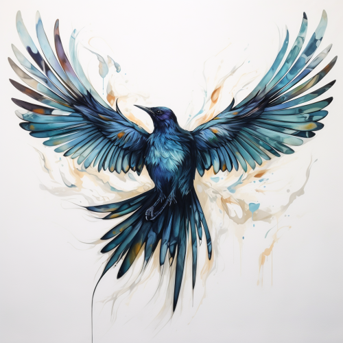 A stealthy, majestic bird in flight, such as an eagle or phoenix, designed with a spray paint aesthetic and optimized for DTG printing. The bird should feature a dark color palette with deep blues, blacks, and subtle metallic accents. The spray paint effect should include rough edges, gritty texture, and dynamic splatters, creating a sense of movement and mystery. The falling feathers should blend with the background, incorporating urban camouflage patterns. The overall design should maintain high contrast and clean lines, suitable for high-quality fabric printing with a sleek and stealthy appearance.