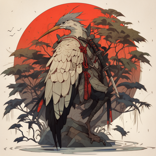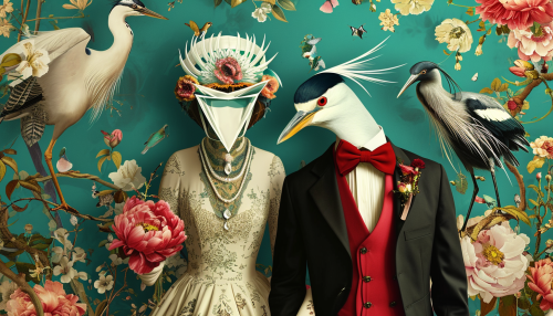kitsch wallpaper style with a wedding dress with bird head and groom suit with heron head surrounded by exotic birds and flowers. colorful. --ar 7:4 --v 6.0