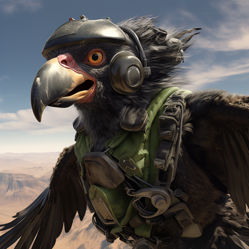 humming bird wearing aviation goggles and riding on the back of a vulture in flight, hyper realistic