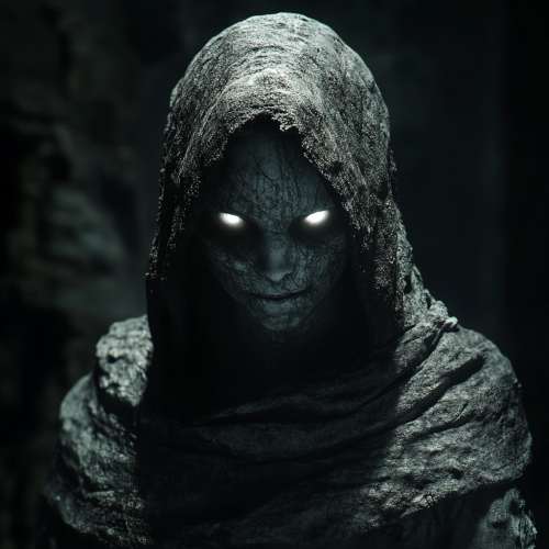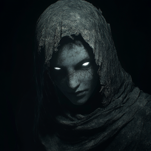The image shows a dark and eerie figure, likely female, with a pale, haunting face. She is wearing a weathered hooded cloak that shrouds her in shadows. Her intense, glowing white eyes pierce through the darkness, giving her an otherworldly, sinister presence. The texture of her face and cloak suggests decay or something supernatural, with dark streaks around her eyes and a grim expression. The entire scene is set against a pitch-black background, enhancing the foreboding atmosphere and focusing attention on her ghostly features. She is wearing a mask that covers only her mouth and nose