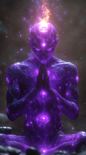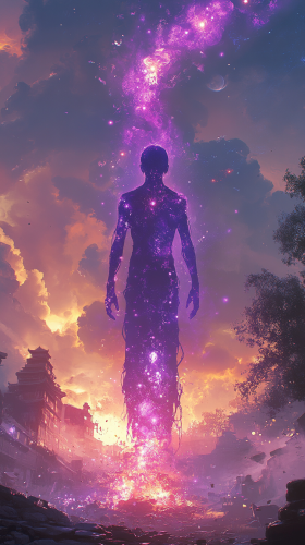 A glowing purple humanoid figure stands confidently, with one half of the scene depicted in vibrant, mystical light representing spiritual awareness, while the other half shows a normal, everyday environment in muted colors. The glowing figure's eyes radiate a bright, ethereal light, symbolizing the ability to perceive hidden truths and energies that others cannot. Surrounding the figure, waves of spiritual energy and cosmic symbols are visible, contrasting with the ordinary world around it. The atmosphere is one of deep insight, showing a world full of unseen possibilities and dimensions. --ar 9:16 --s 750