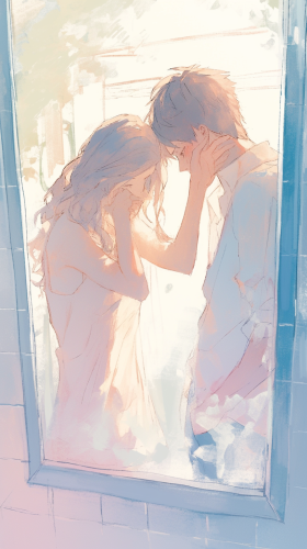 A picture using a watercolor style. Light color. A figure standing in front of a mirror, seeing their reflection but also the image of someone else beside them, showing the pain of realizing their partner may be happier with another. --ar 9:16 --niji 6