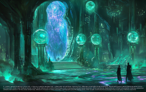 "A cosmic sanctuary floating in the void, a futuristic refuge for beings from alternate realities intricate portals connect multiple dimensions, blending advanced civilizations and hidden histories, with diverse beings glowing alien structures, ethereal technology, harmonious yet eerie atmosphere, vibrant colors with glowing hues, sci-fi concept art, surreal and celestial" --ar 8:5