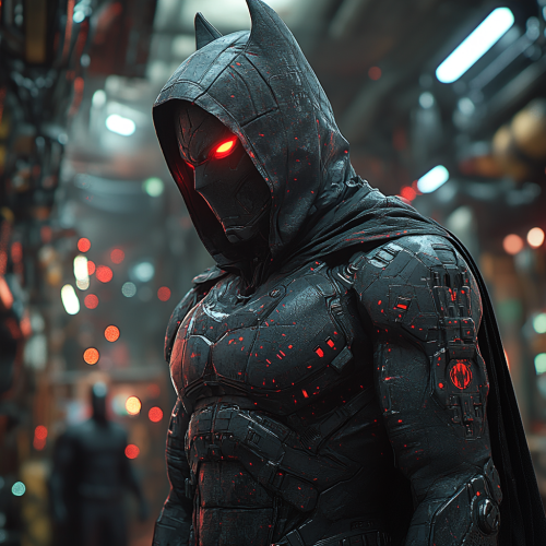 Shadowstrike, a mysterious figure in a dark, hooded suit, standing in the Batcave. His glowing red eyes scan the room, with Batman in the background, half-hidden in shadow. Ultra-realistic, dark and intense --v 6.1 --s 750 --style raw