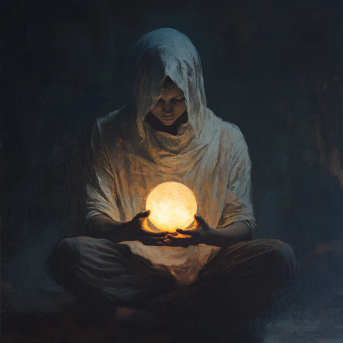 The artwork depicts a mysterious and ethereal scene in which a figure is holding a glowing orb of light. The figure wears a loose, light-colored garment and is illuminated by the soft light of the orb against a dark background. The warm glow highlights the person's face and hands, creating a dramatic contrast and an ambiance of intrigue and serenity. The overall composition emphasizes the interplay of light and shadow, evoking a sense of wonder and contemplation
