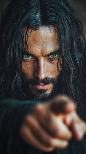create a high resolution image of Jesus Christ, with long black hair, bright green eyes and a serene look, pointing his finger at the camera --ar 9:16