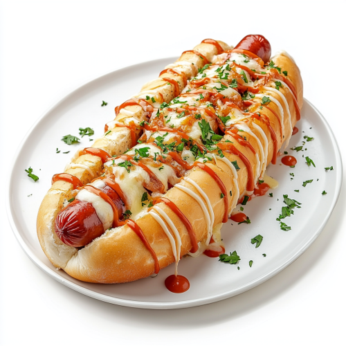 need 8k image of Jumbo Hotdog-bread filled with mozzarella cheese and full jumbo hotdog, Bigger and tastier chicken flavour in white ceramic plate with garnish in high resolution image 100% without any cuts at all 4 sides.