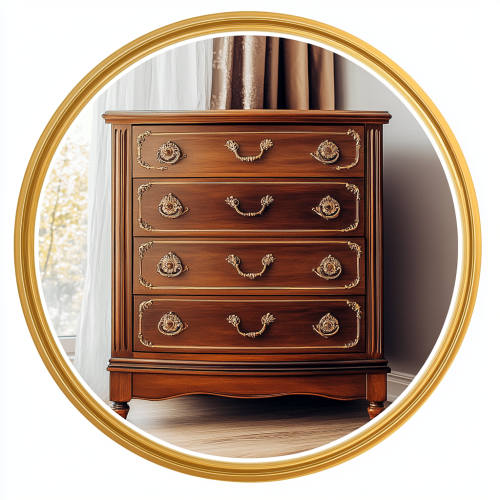 image of chest of drawers. The image should have a circular golden frame around it. It must be a high-resolution image with no text or logo visible inside the circle
