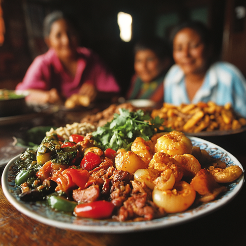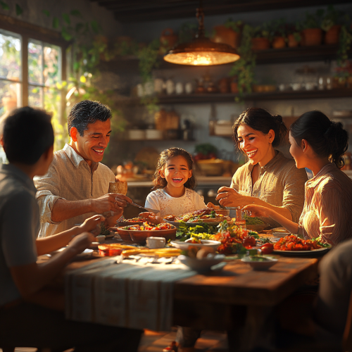 Hyperrealistic scene of a Guatemalan Ladino family gathered around a dining table, sharing a joyful moment together. The family is smiling, engaging in conversation, and enjoying a meal. Warm lighting fills the room, highlighting the details of their faces and the traditional Guatemalan dishes on the table. The background shows a cozy, modest kitchen with natural wooden furniture and traditional Guatemalan decor. The atmosphere is filled with happiness, love, and togetherness, capturing the essence of a close family sharing quality time. --s 250