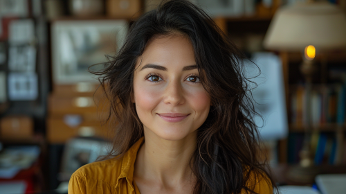 a super hyper-realistic frontal medium shot of a guatemalan regular black hair woman in his 45s, poised in front of an office desk. His gentle smile and wise eyes suggest a moment of reflection. The desk, laden with papers and a vintage lamp, provides a warm, illuminating glow office interior. Captured Using iphone amateur camera, ultra-high resolution, dynamic lighting, vibrant color saturation, natural depth of field --ar 16:9 --v 6.0 --s 1000 --style raw --c 10