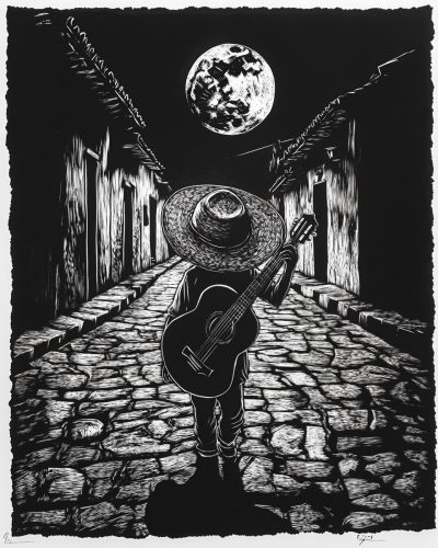 a small human dwarf wearing a large mexican hat, carrying a guitar in one hand and a glass sphere on the other hand, standing in the middle of a stone paved street of Antigua Guatemala, the moon on the back makes a dramatic backlight at night, style stamp linocut printmaking, monochromatic, --ar 4:5