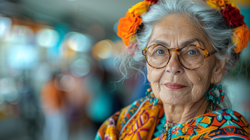 A super hyper-realistic wide portrait of a female guatemalan in his 40s, with a gentle smile and wise eyes. The background is a softly blurred hospital, hospital lights. Captured Using: Hasselblad X1D, Kodak Ektachrome E100, ultra-high resolution, dynamic range, vibrant color saturation, meticulous detail, natural depth of field, realistic texture, engaging expression --ar 16:9 --v 6.0 --s 1000 --style raw --c 10