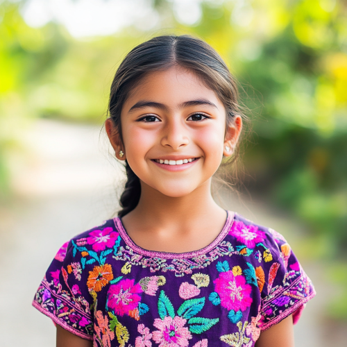 Create a vertical photo (aspect ratio 1024x1792) of a young Guatemalan girl standing outdoors, smiling warmly and confidently. She has dark hair tied back, and her face is illuminated by soft sunlight, highlighting her happiness and strength. She is wearing a traditional blouse adorned with vibrant, intricate embroidery in shades of pink and purple, with colorful floral patterns. The background shows a blurred path and green trees, emphasizing her presence. The image should capture a sense of hope, joy, and empowerment, reflecting the fight for girls' rights and a bright future. Use a Canon EOS camera with an EF 50mm f/1.8 lens to achieve sharp focus on the girl while softly blurring the background, creating a professional and natural look.