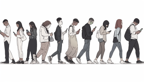 a row of hispanic guatemalan rockers standing, all checking their cell phone, it is evident and highlights that only one person looks happy checking their cell phone. tao comics nathan, in the style of line and dot work, political illustration, white cream background, hasselblad 500c/m, rinpa school, sleek, interactive media, slender --ar 7:4 --niji 5 --style original --seed 2161646623