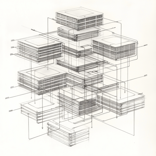 Detailed pencil sketch of interconnected databases on a solid white background. The sketch features multiple rectangular database tables with visible columns and rows, linked by fine lines to represent data connections. Each table is shaded lightly with precise, technical detailing, and arrows indicate data flow between them. The overall style is minimalist and clean, emphasizing the organized structure and connectivity of the databases against the plain, white backdrop.