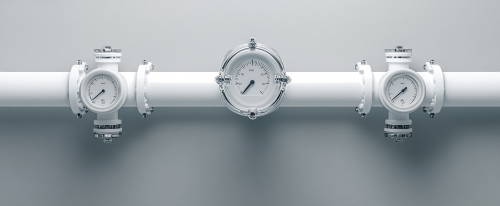 A water flow meter on a horizontal pipe, white main body, metal decoration on the front of each pipe, glass cover on meter, straight pipe, two holes at both ends of the vertical drawing lines for circular chart display. The overall shape is simple, exquisite, high-definition, and detailed. --ar 128:53