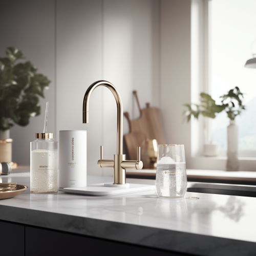 The image serves as the main visual for a national promotional campaign of a high-end brand. Compositionally, the focal point is on the right side, with the countertop and products placed to the right, leaving the left side clean and spacious, utilizing negative space. The content features two high-end water purifiers on a minimalist kitchen countertop, with two faucets from which water flows, one emitting steam, suggesting purity and functionality. The foreground shows a tranquil, expansive lake with slight ripples, while the vast background transitions into space, dominated by a vividly outlined moon. This setup highlights the water purifiers' premium branding and advanced technology, all set against a theme of high-tech blue and surreal minimalism.ultra detail,ultra precision --v 5.2