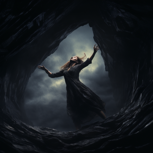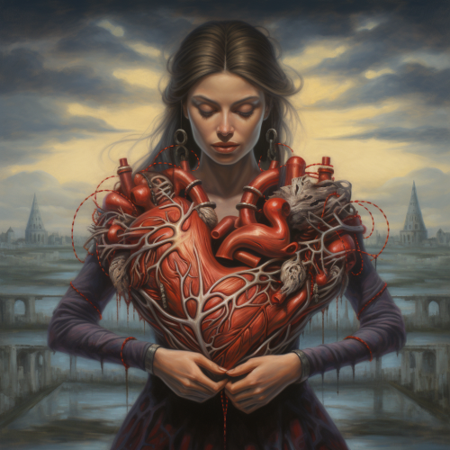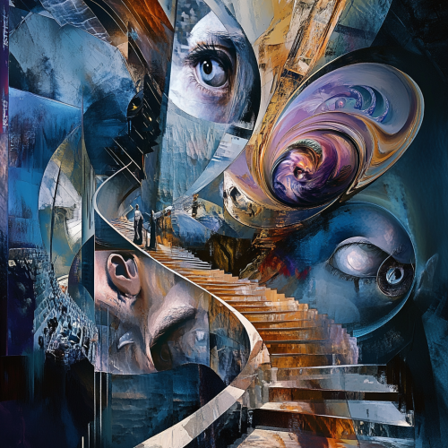 A visually intriguing and complex scene that captures the essence of emotional confusion and mixed feelings. The setting could be a surreal or abstract environment, such as a maze of mirrors reflecting different emotions, a swirling mix of colors and shapes, or a scene with contrasting elements that symbolize emotional turmoil. The central focus is on elements that represent the complexity of confusing feelings, such as figures with expressive, uncertain faces, overlapping or intertwining patterns, or a visual representation of conflicting emotions. The background features a blend of disorienting colors like deep blues, swirling purples, and muted grays to enhance the sense of emotional confusion and uncertainty. Subtle details like abstract shapes, fragmented imagery, or distorted perspectives add to the atmosphere of emotional complexity. The overall mood is introspective and thought-provoking, capturing the essence of grappling with confusing and conflicting feelings.