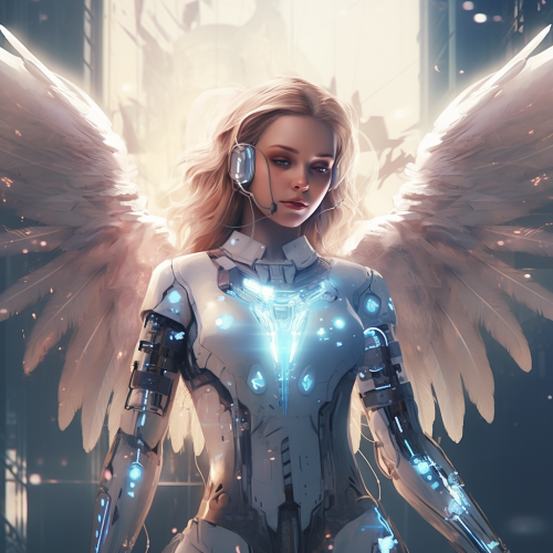 Illustrate AI as a guardian angel, symbolizing its capacity to provide emotional support and care, even in the digital realm