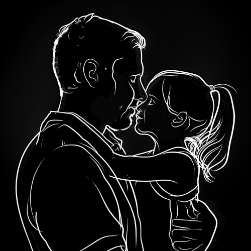 Contoured silhouette of a dad hugging a child a teenage girl lines are clear white black background