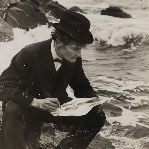 Edvard Munch at the seaside, sketching the tumultuous waves, his face reflecting the turmoil and serenity of nature, mirroring the emotional depth and complexity of his art.