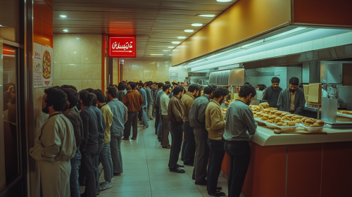 real-life medium shot of a man with a hungry, serious expression, holding a hamburger in one hand and mid-bite, chewing a third of the burger, while reaching into the fridge with his other hand, grabbing a jar of mayonnaise. The fridge is 190 cm tall, filled with unhealthy food like half a stick of sausage, salo (pork fat), onions, dumplings, mayonnaise, and ketchup. The man is 180 cm tall, has a body type similar to the character in a white T-shirt from the reference, daylight naturally filling the room. Shot with a Canon EOS-1D X Mark III, 50mm lens, realistic textures and natural colors --ar 4:5 --style raw --quality 2