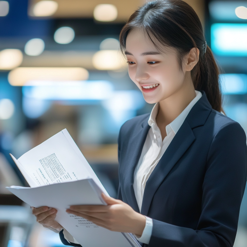Taiwanese female banking employees, wearing formal bank uniforms, standing at bank counters or desks. She is smiling, holding a document or presentation folder, and pointing to the data in it, symbolizing introducing low-interest bank loan options to customers