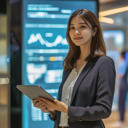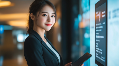 A Taiwanese female bank clerk stands next to the bank's digital screen in a modern office environment. She should be wearing professional business attire, holding a tablet computer, and introducing information about pure online banking loans. The background can display a large screen displaying the online banking interface, highlighting the digital features of pure online banking. The photo should clearly convey her professional and friendly attitude, as well as the modern and efficient nature of a pure online banking loan. --ar 16:9