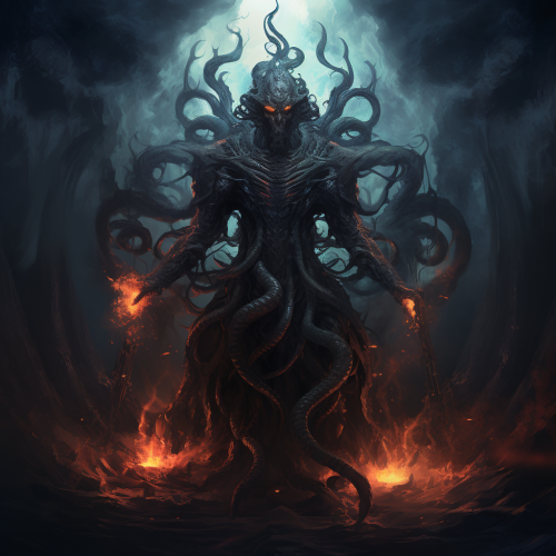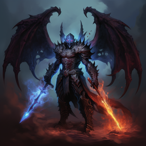 Create a powerful and imposing DnD 5e artwork of an archdevil with piercing blue magic eyes. He has a strong and jagged body and large demonic wings. There are blue flames all around him and coming from him. He carries a large demonic sword with large magical rubies in it. The sword is on fire with blue magic flames.