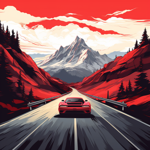 I need an artwork piece for an automotive website hero section; the colors are red, white, and grey; I need mountains incorporated in the piece