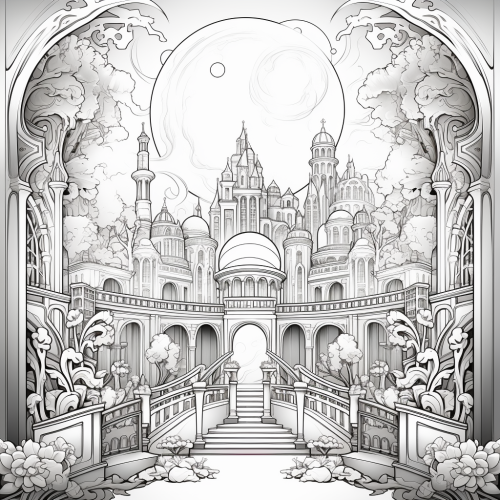 coloring pages for kids,In the heart of the moon, an enchanting lunar colony flourishes, adorned with intricate and whimsical designs. The concept art depicts a painting that captures the colony's breathtaking beauty. The focal point of the image is a majestic lunar palace, adorned with ornate golden carvings and vibrant stained glass windows depicting celestial scenes. The palace is surrounded by delicate gardens with iridescent flowers, and winding pathways lead to whimsical towers topped with crescent moon-shaped domes. The artist skillfully portrays the colony's ethereal atmosphere through a combination of soft pastel hues and a luminescent glow that emanates from within. Every detail is meticulously crafted, showcasing the high level of artistry in this captivating image. by alex1shved, cartoon style, thick lines, low details, black and white, no shading --v 5.2