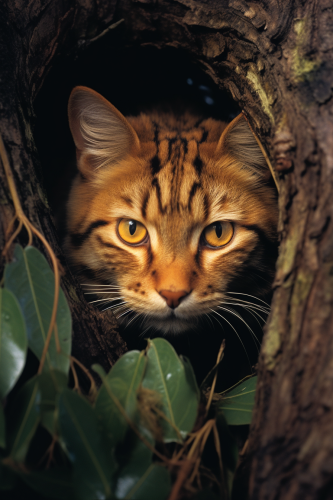 color photo of: "A cat with lion-like eyes, tiger-like fur, rabbit-like ears, and the size of an elephant, next to a tree" ,In this fantastical image, a cat with fierce, lion-like eyes captures our attention. Its gaze is piercing, exuding a sense of power and strength. The cat's fur is reminiscent of a majestic tiger, with bold stripes that add to its wild and untamed appearance. Perched atop its head are long, rabbit-like ears, giving it an endearing and playful quality. The astonishing size of the cat is truly remarkable, as it stands as tall as an elephant. Its towering presence is a testament to its uniqueness and awe-inspiring nature. The juxtaposition of the towering feline next to a tree further emphasizes its colossal stature. The tree, with its branches reaching towards the sky, serves as a visual anchor, grounding the scene and providing a sense of scale. The combination of these elements creates a surreal and captivating image that sparks the imagination. While capturing such a scene would require extraordinary artistic interpretation or digital manipulation, the image invites us to ponder the limitless possibilities of nature's wonders and the beauty that can emerge from unexpected combinations. --c 10 --ar 2:3