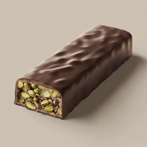 Create a minimalist chocolate bar label for the brand MYDAYS featuring a hyper-realistic image of a Kunafa Pistachio-flavored chocolate bar, with gooey kunafa filling and pistachios inside, looking indulgent and appetizing