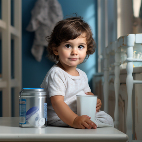 hyper realistic photo, modern of baby 3 years old dark hair, drinking sippy cup with milk, sitting in a safe chair, next to a blue Tin of baby milk in powder. Mpm and Kitchen in the background, blurred. For advertising of the Tin